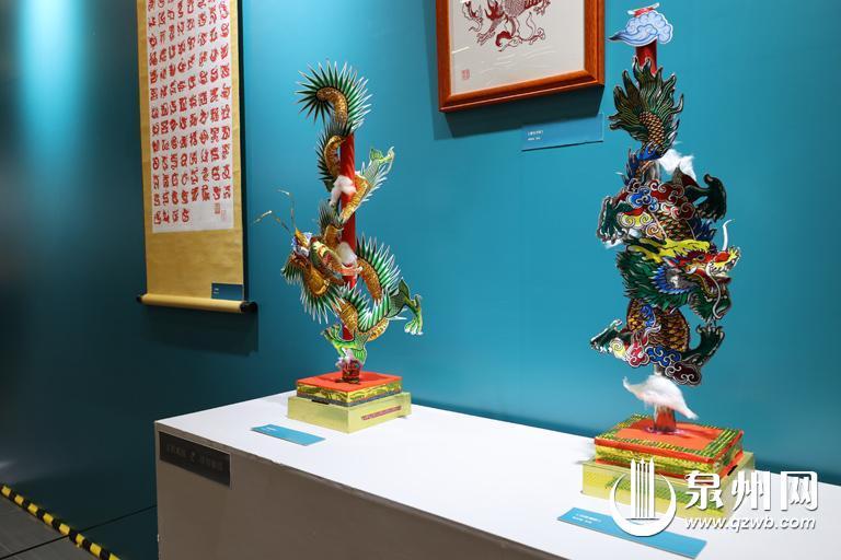 泉州网4月19日讯(融媒体记者龚翠玲 胡彦明 文/图)木雕《龙柱》、影雕《祥龙纳福 五福临门》、瓷器《祥龙戏珠》、堆剪《蛟龙得水》、刻纸《百龙图》、金苍绣《掌中木偶龙袍》……昨日,“祥龙启福”非遗大师作品展开幕,大师们以“龙元素”创作的丰富多彩的非遗作品让人叹为观止。通过非遗大师们的艺术演绎,市民朋友可尽情探寻龙在中华文化中的丰富内涵。据悉,此次展览将持续至5月20日,有兴趣的市民可前往泉州市图书馆负一楼观展。除了展览本身,展馆外还有兼具美感与实用价值的文创作品以及“泉州龙龙”艺术装置同步展出。