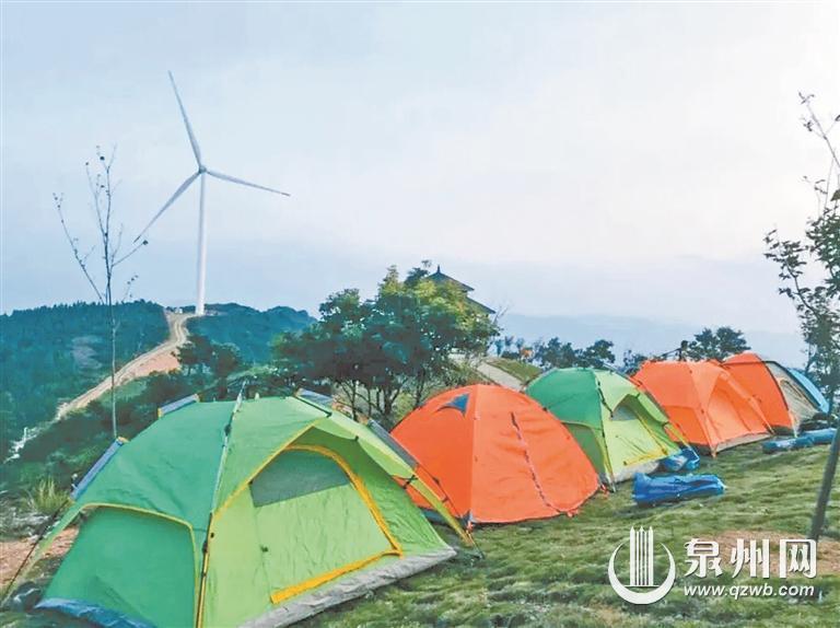 永春县外山乡云峰村天竺山距县城30余公里。驱车从县城出发一路向东,经过闽南九寨云河谷,再沿盘山公路穿过密林,就到达大风车露营地。随风而动的风车、青葱的梯田……与落日打造最佳氛围感,每拍一张照片都是大片。露营在离天空最近的山巅,边和三五好友聊天边品尝各色缤纷的食材,看风车转动,感受人生的平静时刻。