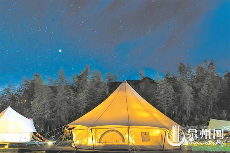 南安翔云星空帐篷露营地距离泉州中心市区48公里,海拔高达800米,设有10个房车位、40个露营野帐位、烧烤场地。这里地形开阔,四周自然环境优美,远离城市喧嚣,具有得天独厚的观星条件。天气晴好时,夜里抬头便可看到漫天繁星,在深黑的天幕中组成光芒闪烁的画卷,宛如置身童话世界。