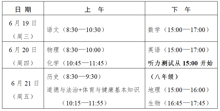 1.省级统一考试。2024年中考省级统一考试安排在6月19日—21日举行,具体科目考试时间安排如下: