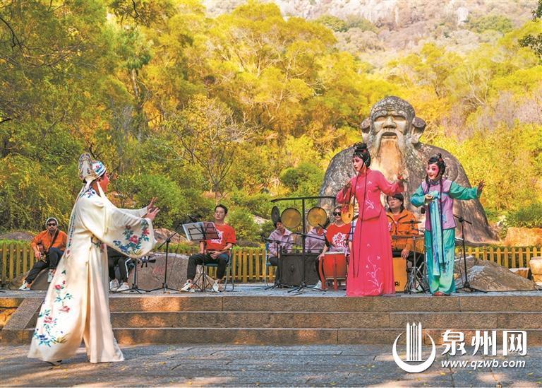 梨园戏唱词以泉州腔闽南语为准,在世遗点老君岩前的沉浸式演出,“恪守传统也突破传统”。(康荣彬 摄)