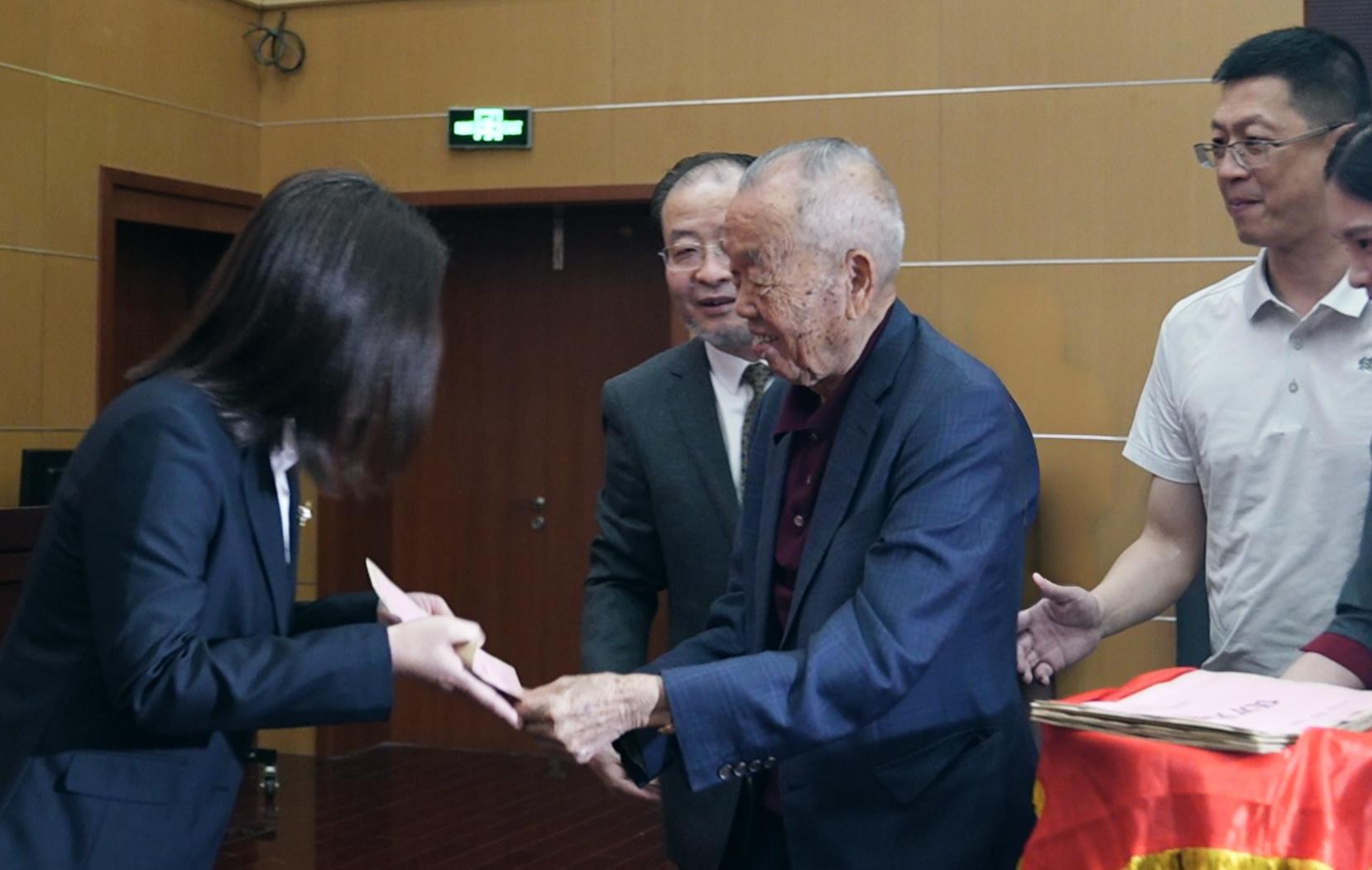 会议中,荣获该院2023年度先进科室、先进工作者,发表SCI文章获奖人员、CSCD文章获奖人员,科研课题、科技成果奖获奖人员及代表分别登台接受表彰。其中,在最令人瞩目的“和敏奖·十佳医护团队”颁奖环节中,87岁高龄的丁和木先生再次受邀参会,精神矍铄的他,亲切地将装有奖金的红色信封,逐一分发给获奖医护人员。