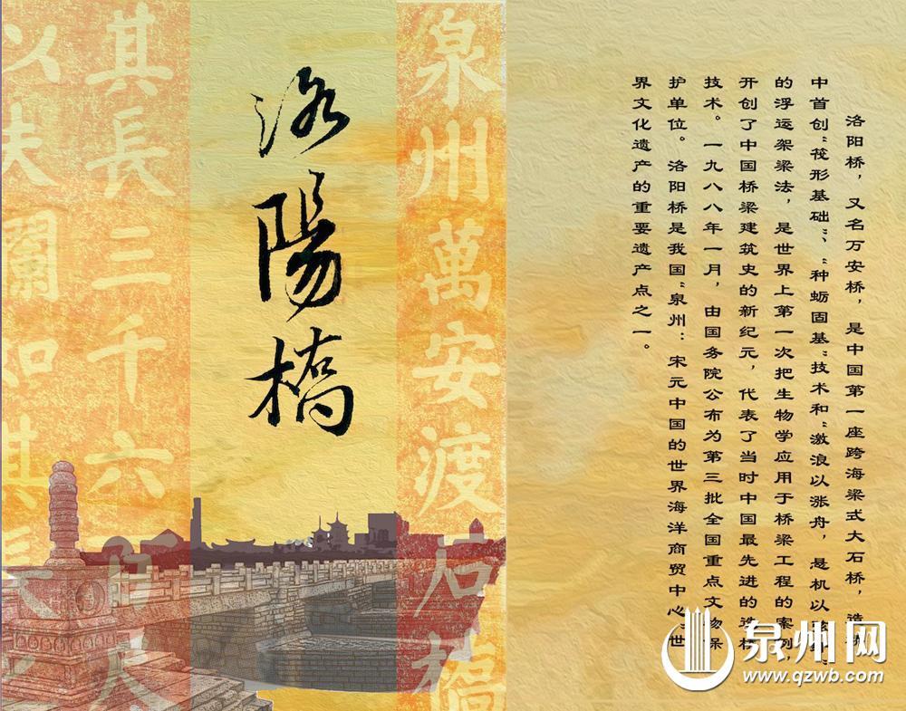 洛阳桥是现存最早的跨海梁式石桥,位于洛阳江水道之上,也是著名的跨海梁式大石桥,素有“海内第一桥”之誉,是古代“四大名桥”之一。宋皇祐五年(公元1053年),泉州太守蔡襄主持洛阳桥建桥工程,前后历时六年建成了这座跨江接海的大石桥。2021年7月25日,“泉州:宋元中国的世界海洋商贸中心”由第44届世界遗产大会审议通过,被列入《世界文化遗产名录》,成为中国第56处世界遗产,洛阳桥是22处代表性古迹遗址之一。