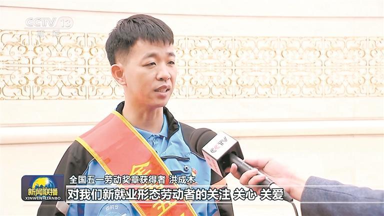 当晚《新闻联播》播出的画面中,身穿蓝色工作服的洪成木在大会现场显得格外显眼,他在现场接受采访时说:“能感受到党和政府对我们新就业形态劳动者的关注、关心、关爱,我会把这份荣誉传递给更多的外卖小哥,继续服务好每一位顾客,为我们的城市建设贡献一份力量。”