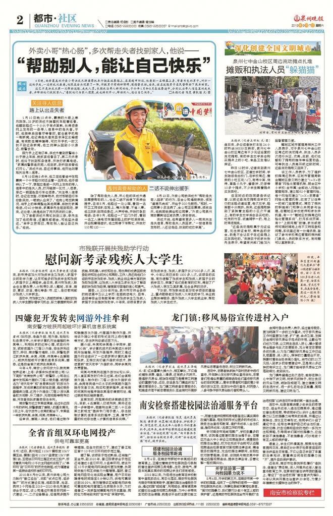 让洪成木最难忘的寻人经历,发生在2019年11月的一个下午。当时,他骑车送餐经过霞美镇军民连心路时,看到了一位打扮时髦的年轻女子。他观察发现,女子神情有些恍惚,看起来像走失者。他立即查看泉州的寻人启事,却没查到有关该女子的寻人启事。因送餐时间将到,他便先行离开。晚上下班回家后,他在网上看到一则寻人启事,上面女子的照片和自己下午所遇到的女子一模一样。他立即联系走失女子家属,让其到霞美镇派出所查看监控寻找下落。