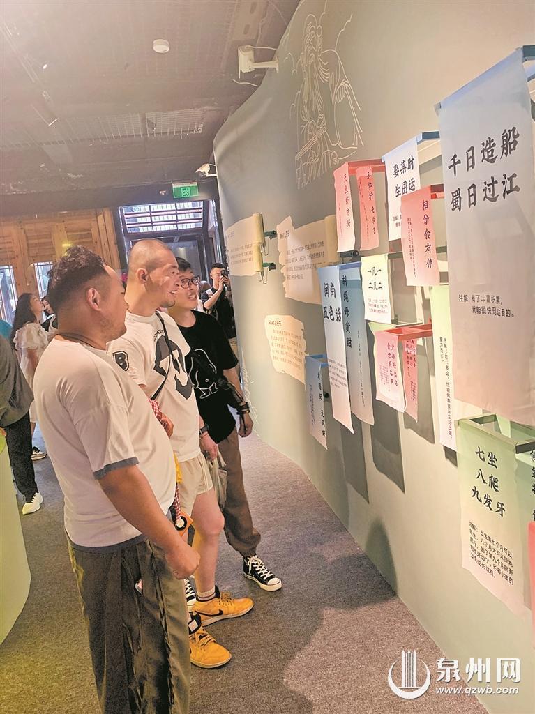 率先映入眼帘的是闽南歇后语展示区。“鸭仔听雷”“一凡一 二凡二”“未学行 先学飞”……一块块彩布上印着趣味十足的闽南歇后语和相应的解释,不时有游客前来品读学习,或是拍照打卡。