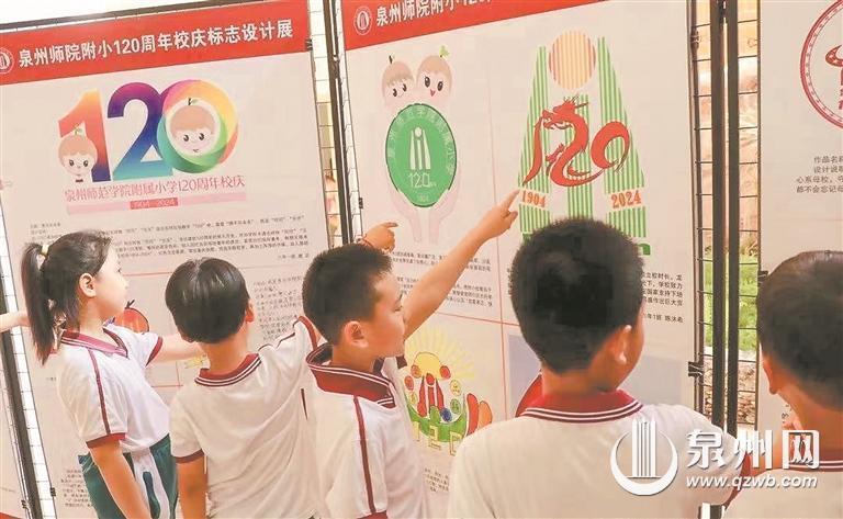学生们在欣赏泉州师院附小120周年校庆标志设计展