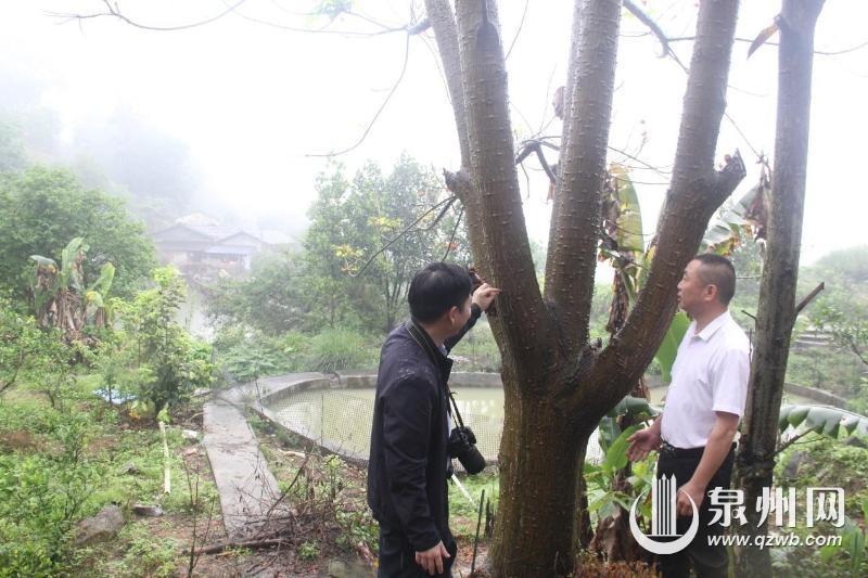 科研团队在南安英都一茶园发现刺桐树,十几年前,茶园主人从村庄小水电站母树折枝扦插培育而成 刘建福/摄