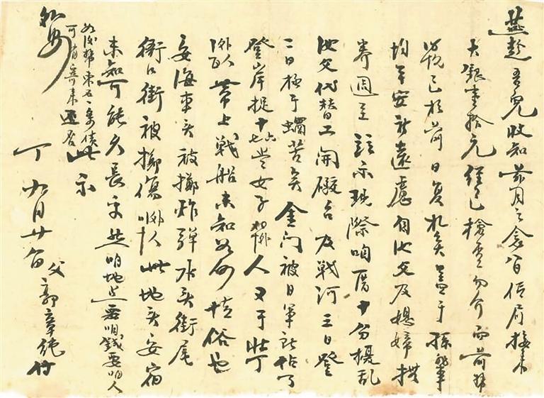 1937年10月,福建晋江东石郭岺乡的郭章纯在寄给马来亚(今马来西亚,下同)太平埠的儿子郭燕趁的回批(注:“批”即“信”)中,记载下了日军在晋江、南安、金门等地进行轰炸并掳掠女子及壮丁的史实。该回批写道:“燕趁吾儿收知……现际咱厝十分扰乱,汝父代替工开炮台及战河[壕],三日登[顶]二日,极于蜗苦矣。金门被日军所占了,登岸捉十六七岁女子40外[多]人,又于[抓]壮丁100外[多]人,带上战船……安海车头[站]被掷炸弹,水头街尾、衙口街被掷伤30外[多]人,此地头安宿未知可能久长乎……”(注:该回批多用闽南方言叙事,[ ]内为其所表达之意。)1937年11月,晋江东石蔡长呌在寄给女婿郭燕趁的回批中也称:“惟前日敌机来炸五里桥,以致住民纷纷逃出外乡,以后不知欲变如何?尚难逆料。”这两封回批系一条信息链,讲述了闽南遭受日军袭击的苦难,以及民众被迫逃难等情况。