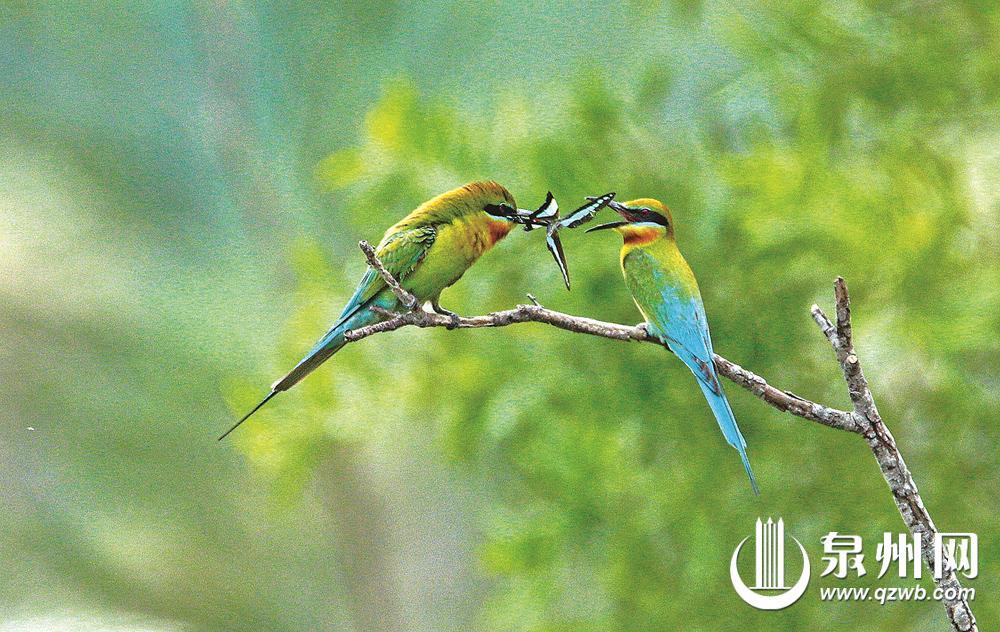 殷勤送礼,耳鬓厮磨,亲嘴踩背,双栖双飞……最美的鸟儿,演绎最美的爱情。进入5月,石狮峡谷旅游路栗喉蜂虎繁殖地,每天都在上演着“撒狗粮”的戏码,从东南亚一带到石狮筑巢安家的逾百只栗喉蜂虎进入“热恋期”。未来三个月,一对对栗喉蜂虎将在这里繁育出下一代。