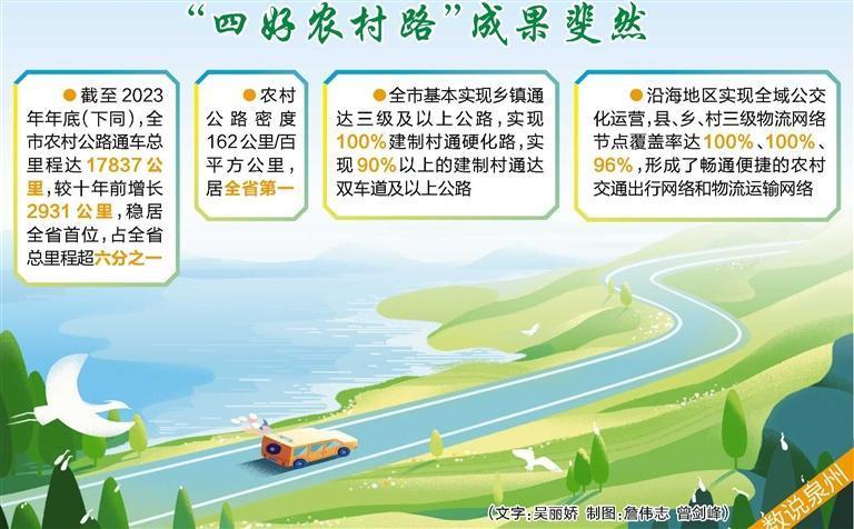 十年来,泉州市交通运输部门持续深化农村公路管理养护体制改革,不断提升农村公路精细化管养水平,使路面使用性能指数PQI达到优良水平。在保障农村路网常态管养基础上,全市重点打造“美丽农村路”614公里,将沿线自然风光、人文景观“串珠成链”,带动沿线种养业、乡村旅游等特色产业发展,铺筑“绿色发展之路”。