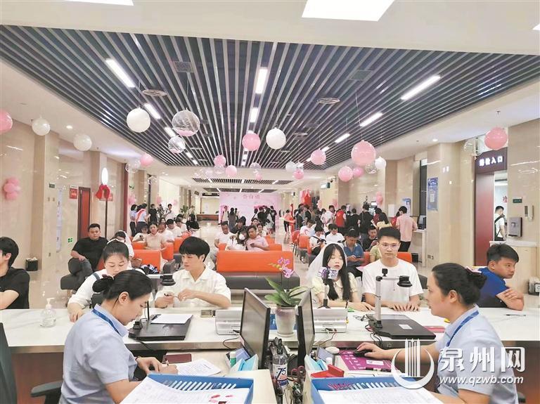 在南安,记者了解到,昨日共有261对新人登记。南安市婚姻登记处还联合南安市妇幼保健院设立婚检便民服务点,为新人们提供免费婚检服务,实现婚登、婚检“一站式”全流程服务。昨日上午10时,南安婚姻登记大厅人头攒动,有的新人到签到板上签下自己的名字,写下对彼此的甜蜜告白,并在背景墙拍照打卡;有的新人手持鲜花,在国徽的见证下,向对方许下爱的誓言,充满仪式感。南安市尚好社会服务工作服务中心负责人陈兵还给新人们开设婚前辅导微讲堂,传授夫妻沟通的技巧,帮助大家树立正确的婚姻观,承担起婚姻的责任,共同经营幸福的婚姻家庭。