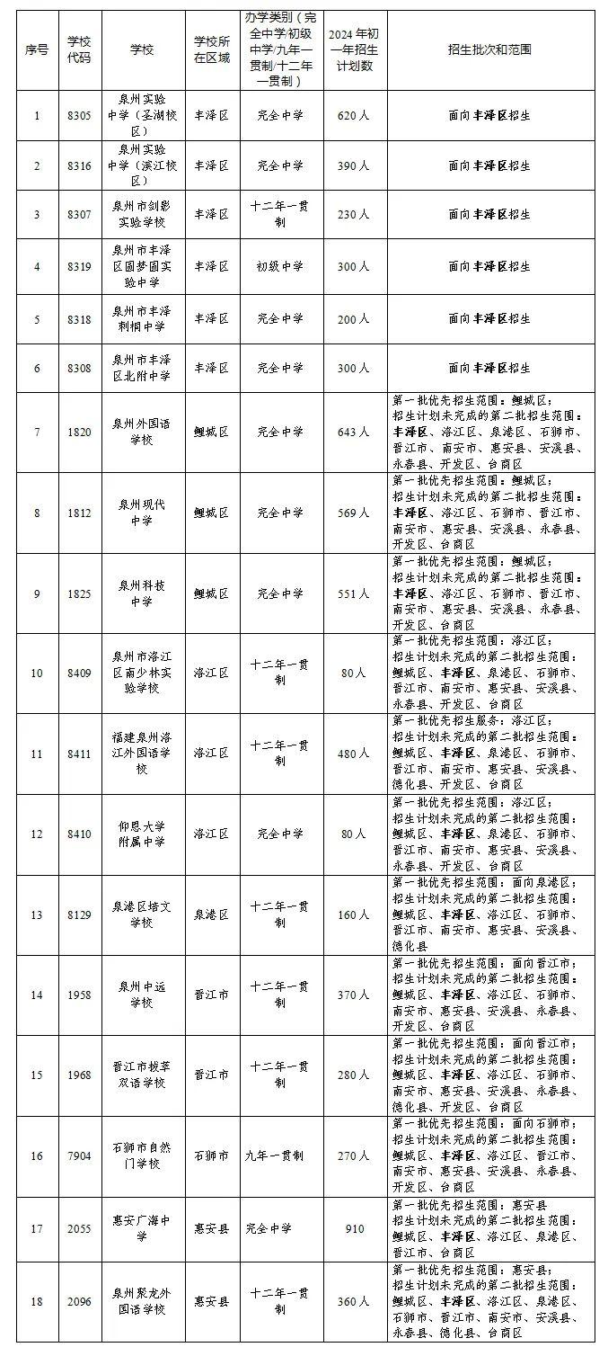 8.2024年全市民办初中学校各批次的招生电脑随机派位录取工作统一由泉州市教育局负责牵头组织。录取具体步骤与志愿填报见《2024年泉州市民办初中学校招生工作服务指南》(附件2)。