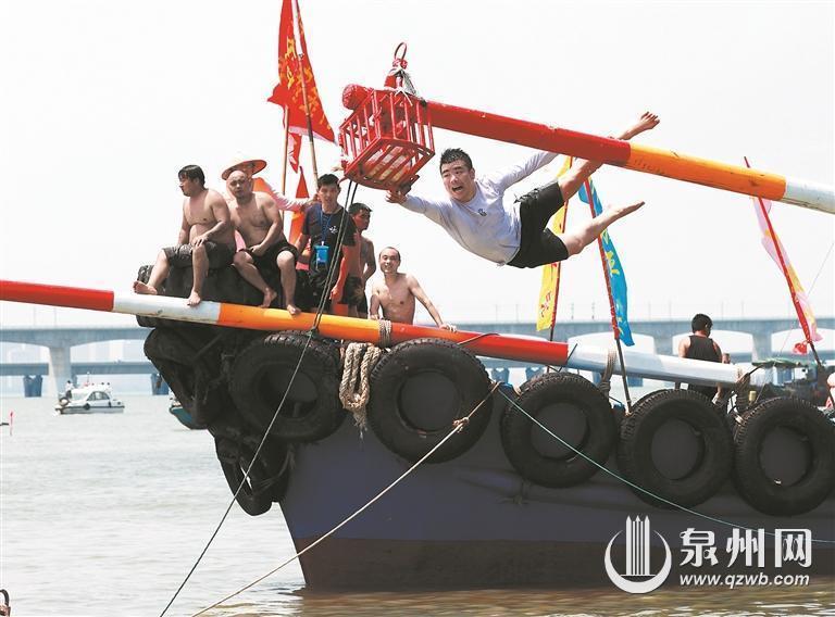 水上捉鸭是泉州沿江沿海一带的端午习俗,在石狮蚶江、晋江安海一带盛行。活动时,把杉木绑好固定在船上或岸边,大部分伸向水面上方,在杉木尾端挂一只笼子,内关鸭子。参赛者光脚从杆头走到尾端,去打开那鸭笼子,抓到鸭子即为成功。但因杉杆事先涂了油,大部分人没走几步就落入水中,引起围观者一阵善意的哄笑。相传这一民俗是由郑成功在安海操练水师的史俗演变,极具挑战性和趣味性。
