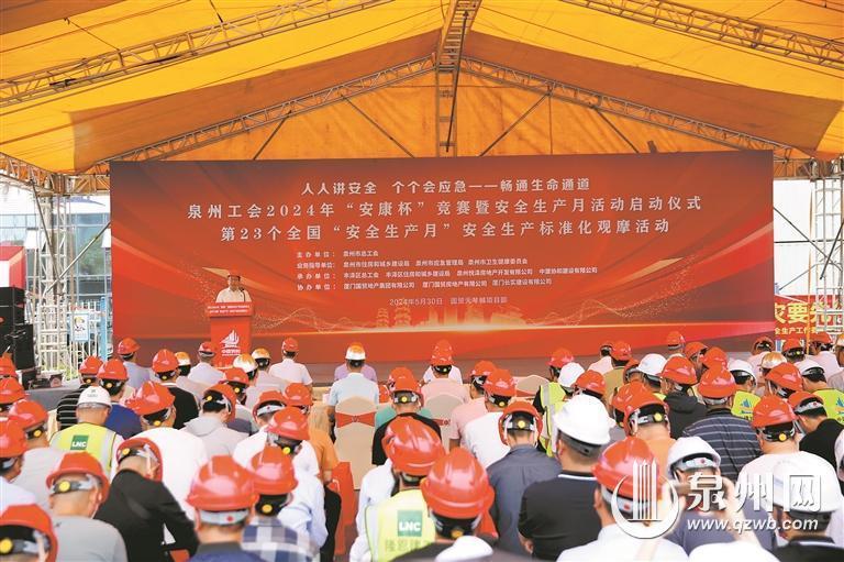 泉州网6月4日讯 (通讯员李亮 杨云燕 融媒体记者龚翠玲 文/图)筑牢安全防线,守护生命健康。今年6月是第23个全国“安全生产月”,近日,泉州工会2024年“安康杯”竞赛暨“安全生产月”活动启动仪式在丰泽国贸中建协和项目工地举行,现场宣读了关于2023年度泉州市“安康杯”竞赛先进集体、个人的通报。活动联办单位负责人分别为2023年度市级“安康杯”竞赛先进单位、先进班组代表授奖、颁牌。市总工会为企业职工送文化、送知识、送安康。企业职工代表上台,进行安全生产宣誓。