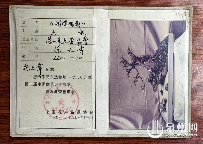 1983年徐文章获福建省首届盆景展览二等奖后,泉州市政府建委、绿委为他颁发的纪念品。