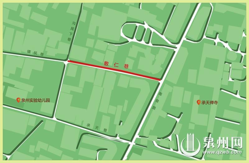 泉州市鲤城区敷仁巷,西接镇抚巷,与沟尾下巷相汇,东抵南俊路。敷仁巷别名夫人巷,巷内原有一座敷人宫,“人”与“仁”谐音,以宫而得名。沟尾下巷因位于古城八卦沟的下端而得名。