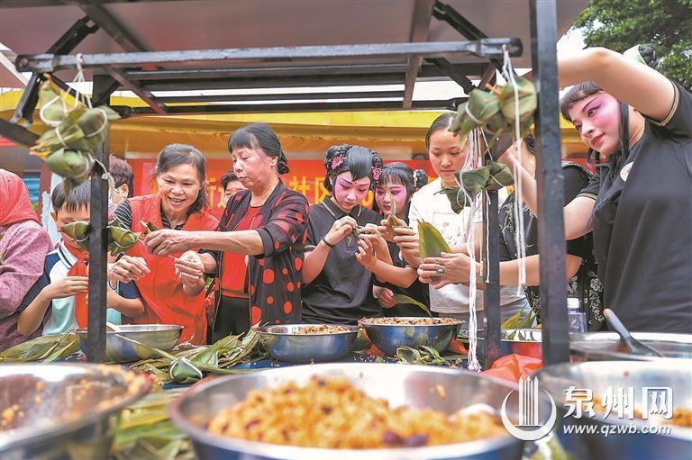 昨日上午9点,在中心市区东湖街凤山广场,居民们从各处汇聚而来。广场摆放的几张桌子挤满了人,居民、志愿者和主办单位工作人员一起包粽子。洁白的糯米,翠绿的粽叶中间夹着红豆,在欢声笑语中,一个个粽子很快被包好。来自泉州市高甲戏传承中心的演员带来《红梅弄》和《管甫送》等经典曲目片段。“太好了,能近距离感受非遗戏剧的魅力。”居民郑先生说。泉州市海外交通史博物馆的工作人员带来《福船的故事》展览,讲解员为居民们讲解福船、海丝的故事,大家听得津津有味。