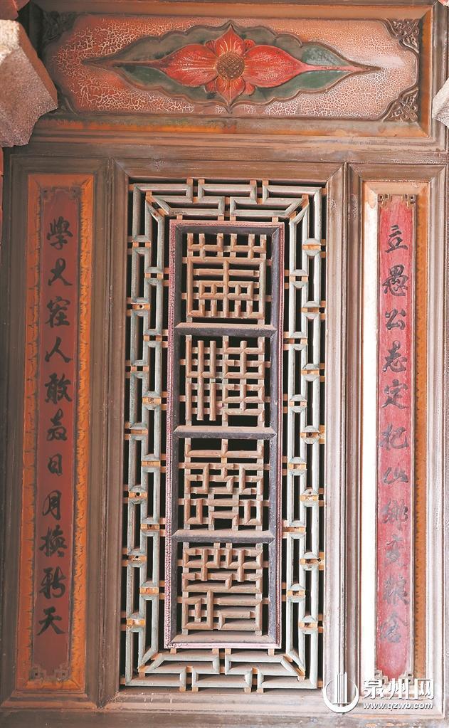 前院楼内可见的柱联有12副,正厅两侧主梁柱上书“远渡南洋,望岁岁生意兴;安居仁里,思代代子孙贤”,这副楹联把华侨“两地一心”的情怀,书写得淋漓尽致。通后院的两个门正上方各雕刻一枚红色五角星,两侧门柱分别书写楹联“克勤克俭千家乐,同心同德万户春”与“春色满园人共庆,东方万里物皆新”,代表了主人对家国美好生活的愿景。