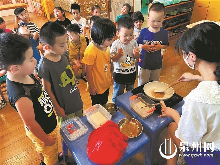 在晋江安海镇苗苗中心幼儿园,学校连续多年开展端午民俗活动,家长进课堂现场制作煎堆,老师讲述“女娲补天”的故事,让小朋友们感受闽南端午丰富的文化内涵。