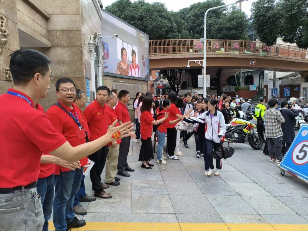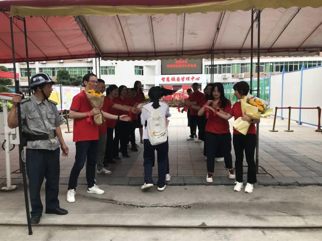 高考第一天上午,泉州九中,老师们穿着红T恤,手捧鲜花,在校门口迎接考生,为他们加油祝福。