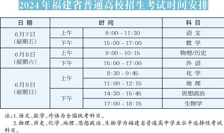 全国统考科目中的外语分英语、俄语、日语、法语、德语、西班牙语等6个语种,由考生在报名时任选其中一个语种参加考试。具体科目考试时间安排详见表格。考生高考总成绩由语文、数学、外语3门全国统考科目成绩和3门选择性考试科目成绩组成,满分750分。其中,语文、数学、外语每门满分150分,物理、历史、思想政治、地理、化学、生物学每门满分100分。语文、数学、外语、物理、历史成绩采用原始分计入;思想政治、地理、化学、生物学成绩依据《福建省普通高中学业水平选择性考试科目赋分办法》转换后计入,只公布转换后的赋分成绩,不公布原始成绩。如有政策性加分,则一并计入高考总成绩。