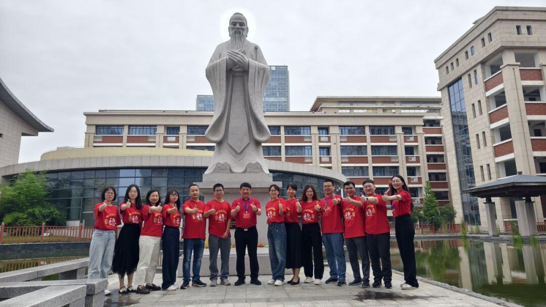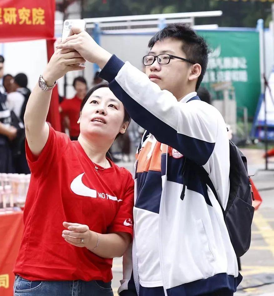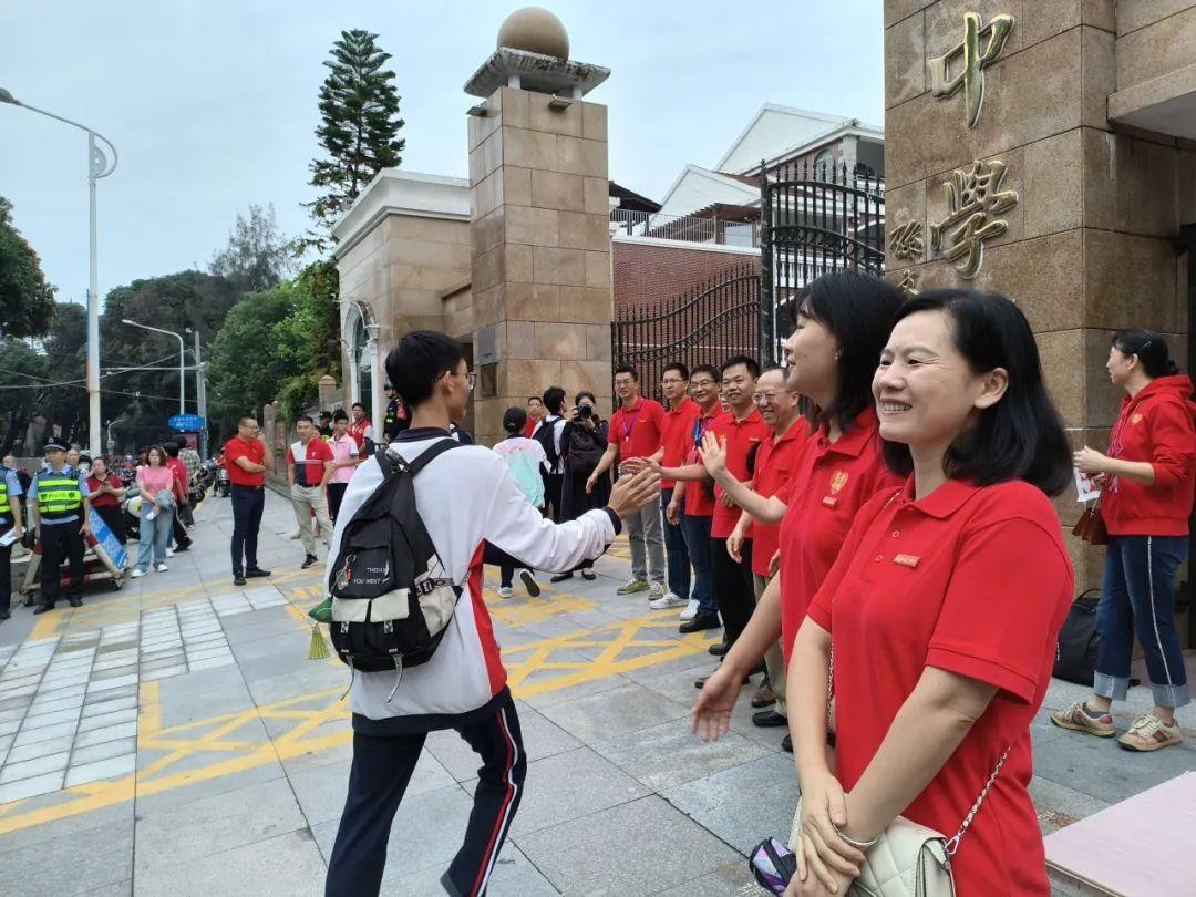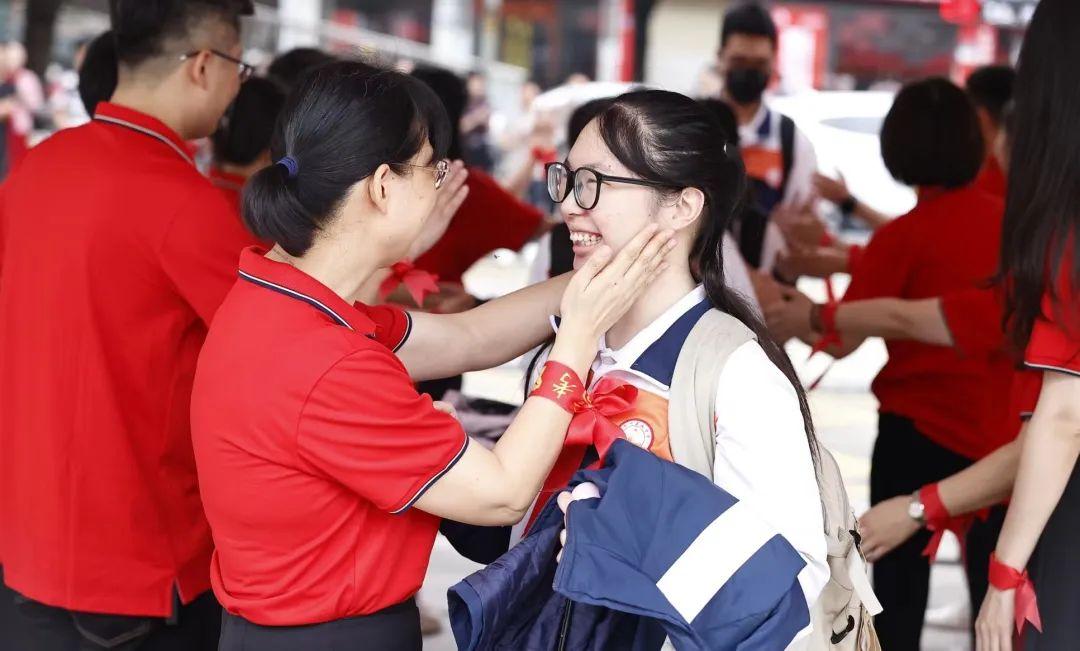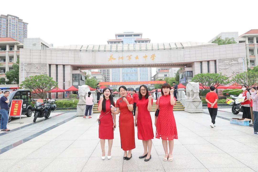在泉州一中(东海校区),老师们身穿定制红衣,为考生们加油助威!