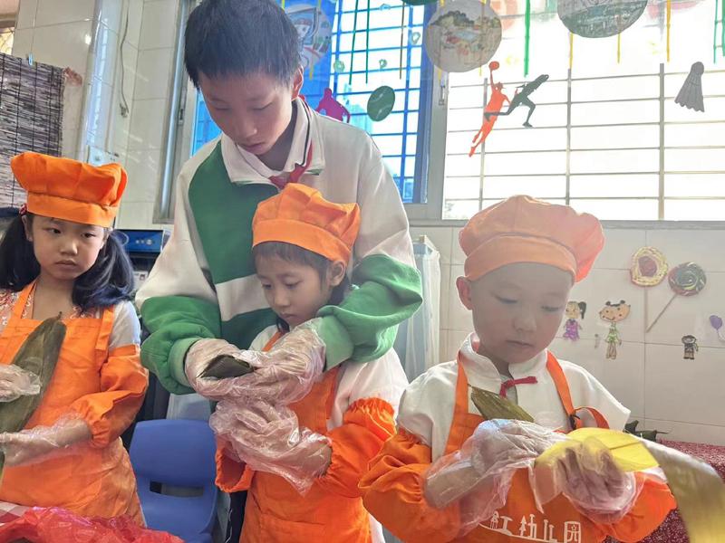 泉州五中学子与东红幼儿园小朋友一起包粽子