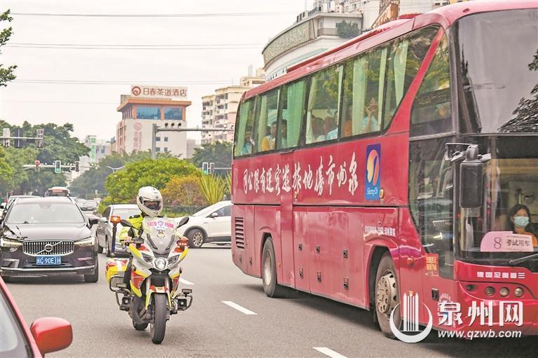 交警护送考生乘坐的校车