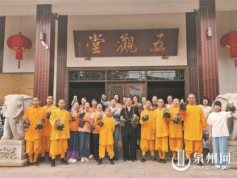 泉州少林寺僧人与公益讲解员一起包粽子送给高考学子,祝愿大家一举高“粽”。 (黄东升 摄)