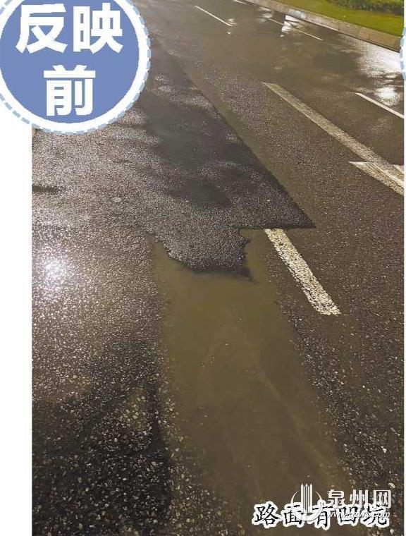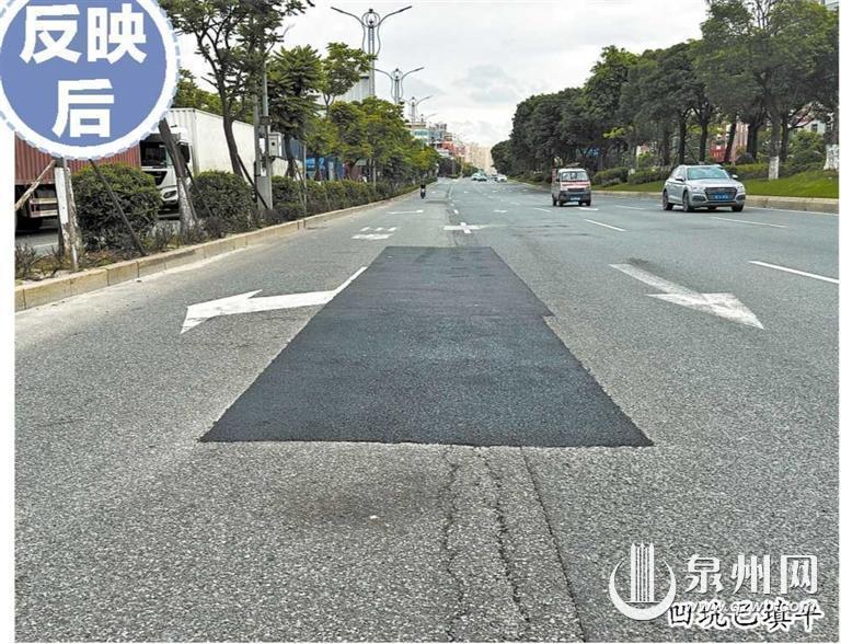 晋江市交通局道路管理科工作人员表示,接到96339反映后,上周五晚,施工人员对道路进行施工,在原先修补的基础上用沥青延伸补了一段,已将凹坑填平了。