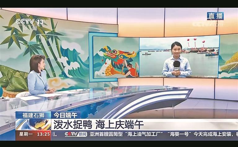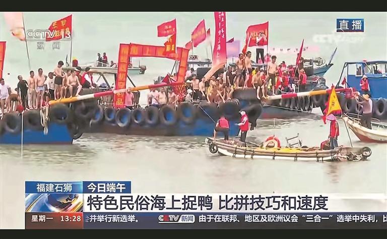 泉州端午民俗文化源远流长。除了赛龙舟,泉州各地丰富多彩的民俗活动如石狮蚶江的海上泼水节、晋江安海的“水上掠鸭”竞技活动、端午“嗦啰嗹”习俗原生态展示等,以其独特的魅力吸引了无数观众的目光,也吸引了央媒的关注报道。6月10日,《人民日报》刊发《品端午习俗 游海丝泉州》一文,聚焦福建泉州及龙岩永定的端午习俗,详细推介泉州“端午风情 海丝泉州”全国乡村旅游精品线路,带读者领略泉州传统端午习俗;6月10日,央视新闻联播以《多彩端午活动 传承家国情怀》为题,介绍石狮蚶江镇“对渡”活动的热闹景象,展示了群众水中掠鸭的有趣场面。