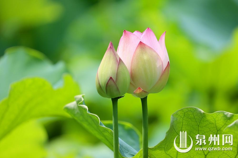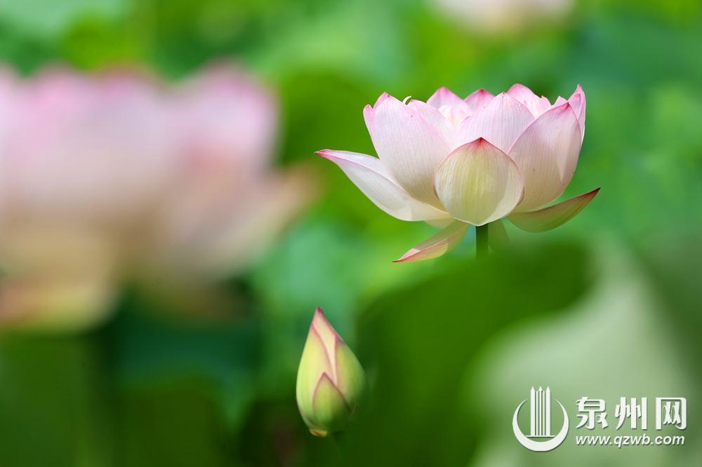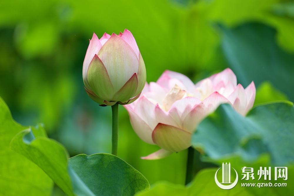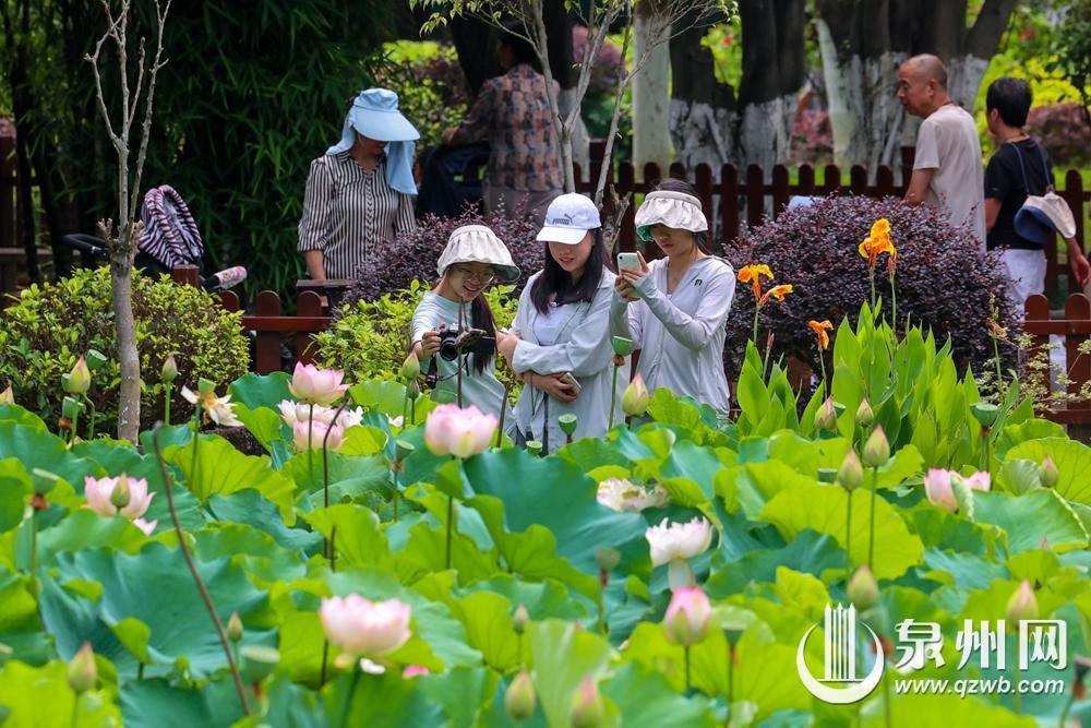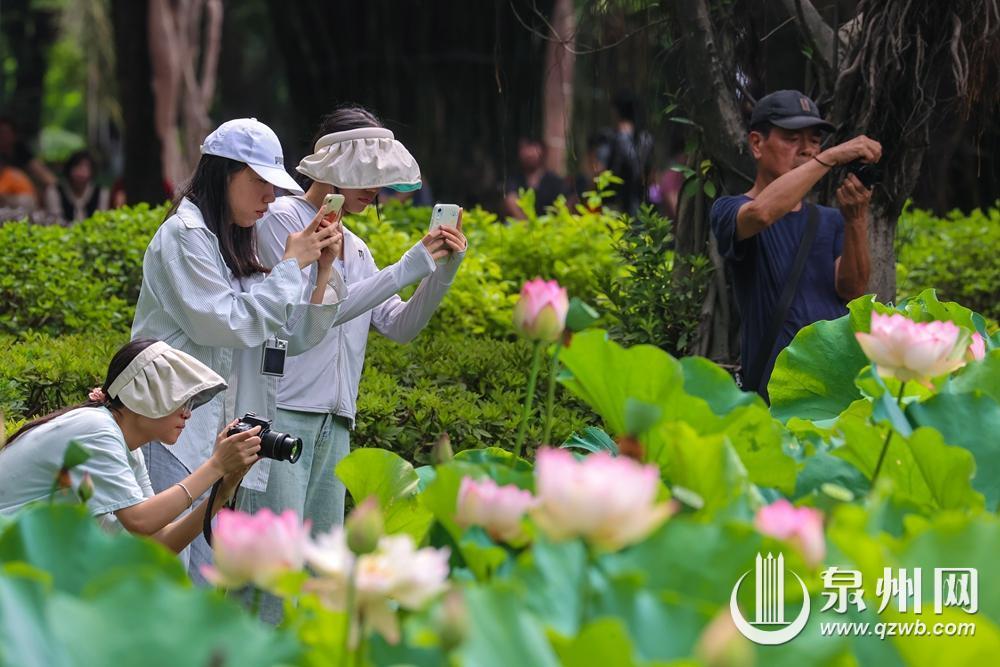 6月12日,泉州市区刺桐公园里,满池碧荷随风起舞,粉白色的荷花在绿叶之间摇曳,吸引人们围观、拍摄。(陈起拓 摄)