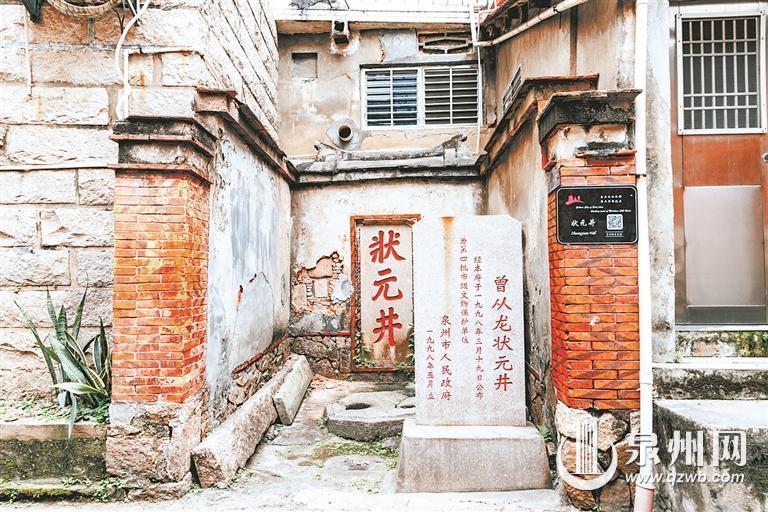 由相公巷回到东街,一路向西,穿过西街东段、经过开元寺,来到西街西段,见到一个妙因宫,就是曾井巷的巷口。巷内,有一口著名的“状元井”,相传曾从龙之母,临产浣衣于井边,急产之下娩出于井盘。南宋庆元五年(1199年)曾从龙24岁中状元,建府第巷内,井在巷内粉墙下。于是,这口井被称为“状元井”。状元井的井盘由花岗石砌成,呈八角形,有两个井孔。南侧墙上有曾从龙裔孙曾士谦在清代嘉庆十四年(1809年)修浚状元井时,题下的三个楷书大字“状元井”。