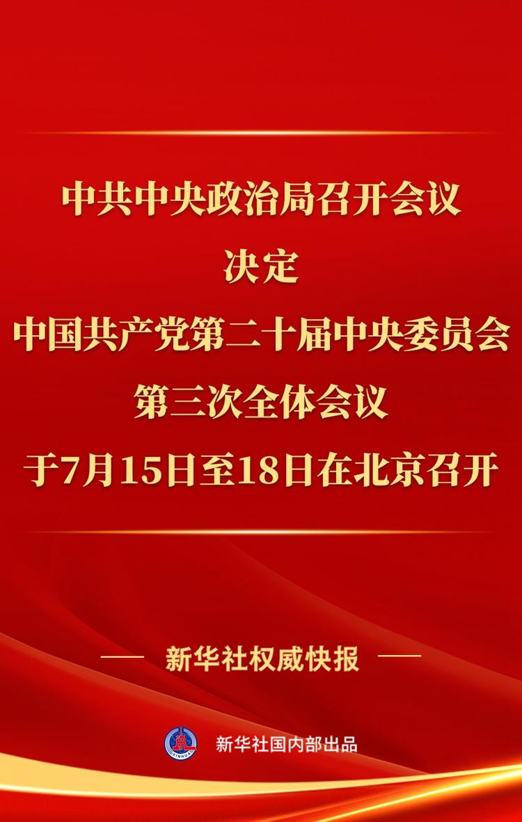 会议决定,中国共产党第二十届中央委员会第三次全体会议于7月15日至18日在北京召开。
