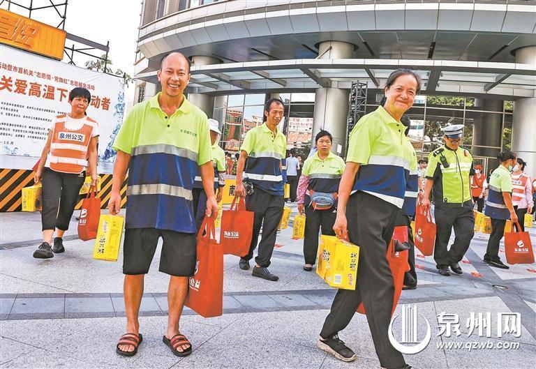 泉州网7月5日讯(融媒体记者 陈明华 许奕梅 傅恒 高云 陈茗香 庄丽祥 文/图)昨日上午,2024年泉州市“我为群众办实事”文明实践活动暨市直机关“志愿情·党旗红”志愿服务活动——“爱心冰柜免费奉水 关爱高温下劳动者”活动启动仪式在泉州市区南益广场启动,爱心团队现场向100名环卫、快递、公交、交警等一线劳动者发放防暑降温礼包,向这些烈日下的最美“逆行者”致敬。同时,在市区多条街道设置的10个“爱心冰柜”服务点和若干奉茶点均已“上岗”,免费提供矿泉水等冷饮。