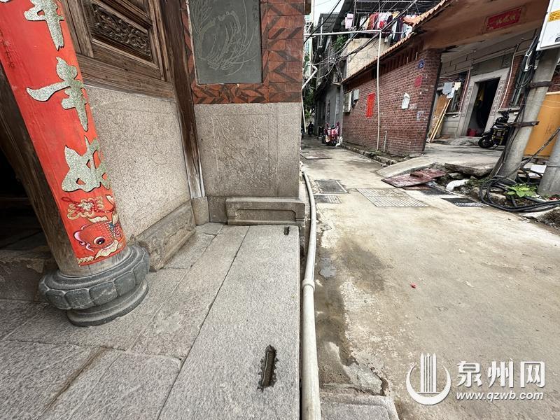 门前石阶上的孔洞,是当年装铁门的痕迹。