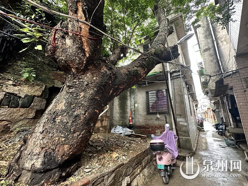 舍人巷尾有一棵树身硕大的“火柴树”,年代久远,枝叶遮住了巷子。