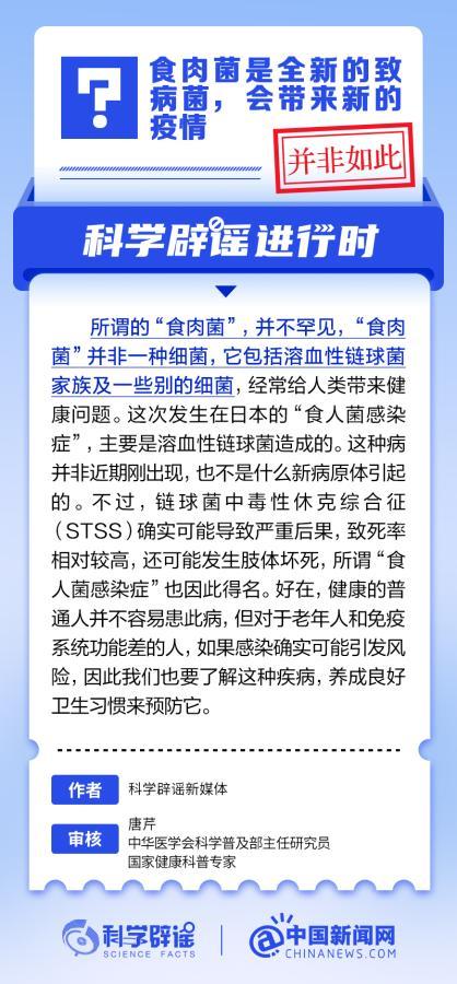 中新网7月10日电 所谓的“食肉菌”,并不罕见,“食肉菌”并非一种细菌,它包括溶血性链球菌家族及一些别的细菌,经常给人类带来健康问题。近期发生在日本的“食人菌感染症”,主要是溶血性链球菌造成的。这种病并非近期刚出现,也不是什么新病原体引起的。健康的普通人并不容易患此病。(来源:@科学辟谣 中国新闻网微博 )