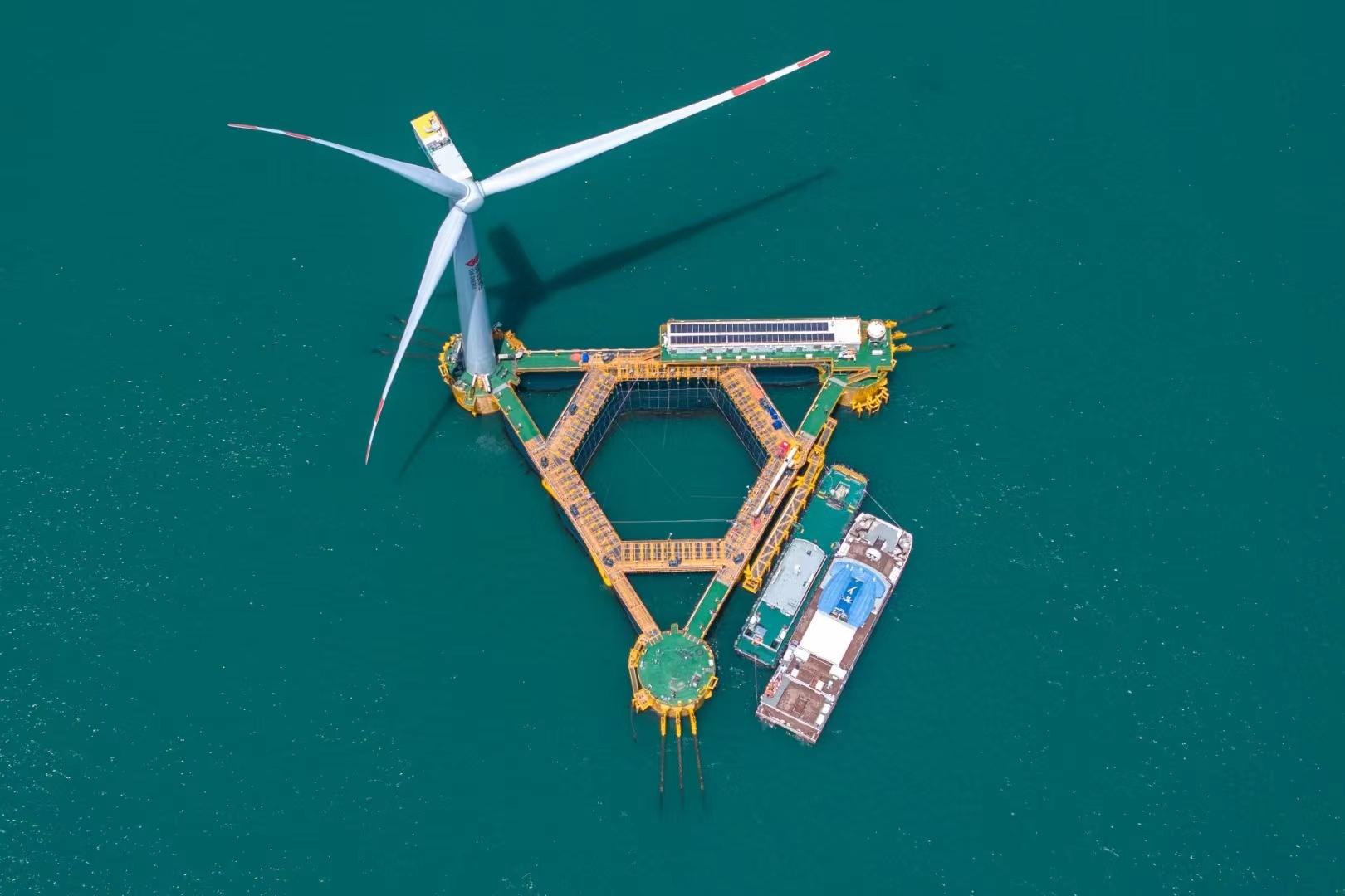 “4兆瓦风电机组在满功率运行状态下一天可发电9.6万千瓦时,约能满足4.2万人一天的生活用电需求;一个养殖周期的鱼品收入可达到数百万元。”该负责人表示,这个平台是深远海漂浮式风电与渔业养殖一体化设计概念在世界范围内的首次创新实践,风、光、渔相融合,实现了海洋空间集约利用、跨产业融合发展。