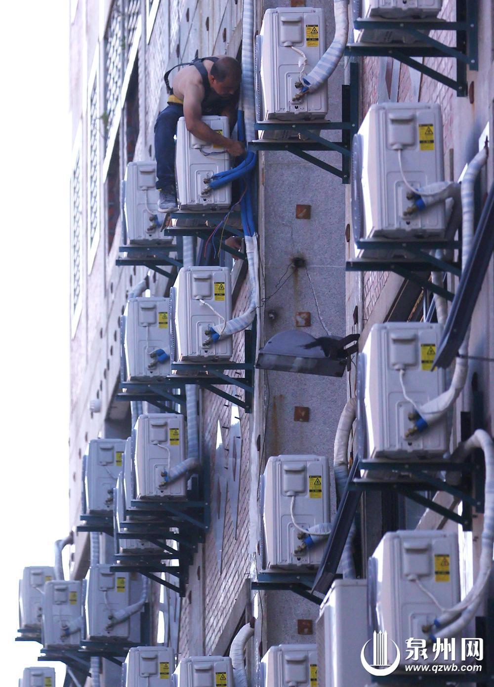 空调安装工人像“蜘蛛侠”一样,在烈日下飞檐走壁,尽快为市民送去清凉。
