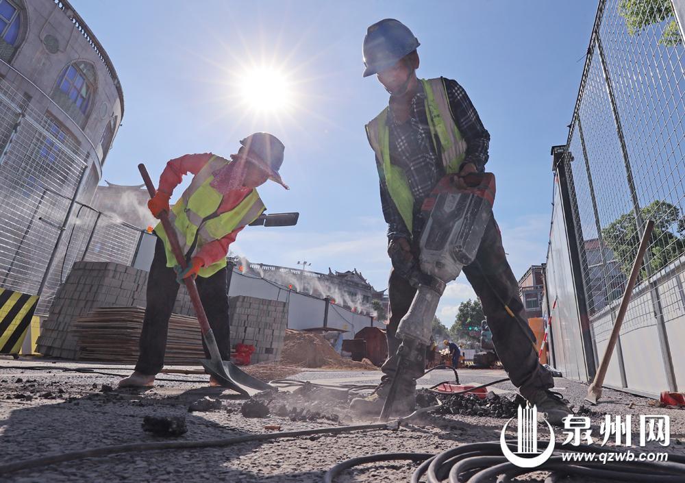 烈日当空,在鲤城区市政基础设施综合修复改造项目涂门街、新门街等路段施工现场,热浪滚滚的路面,伴随着挖掘机的轰鸣声,工人们有的手拿切割机火花四溅,有的负责搬运施工材料,他们各司其职,汗水不停地从脸颊滑下。