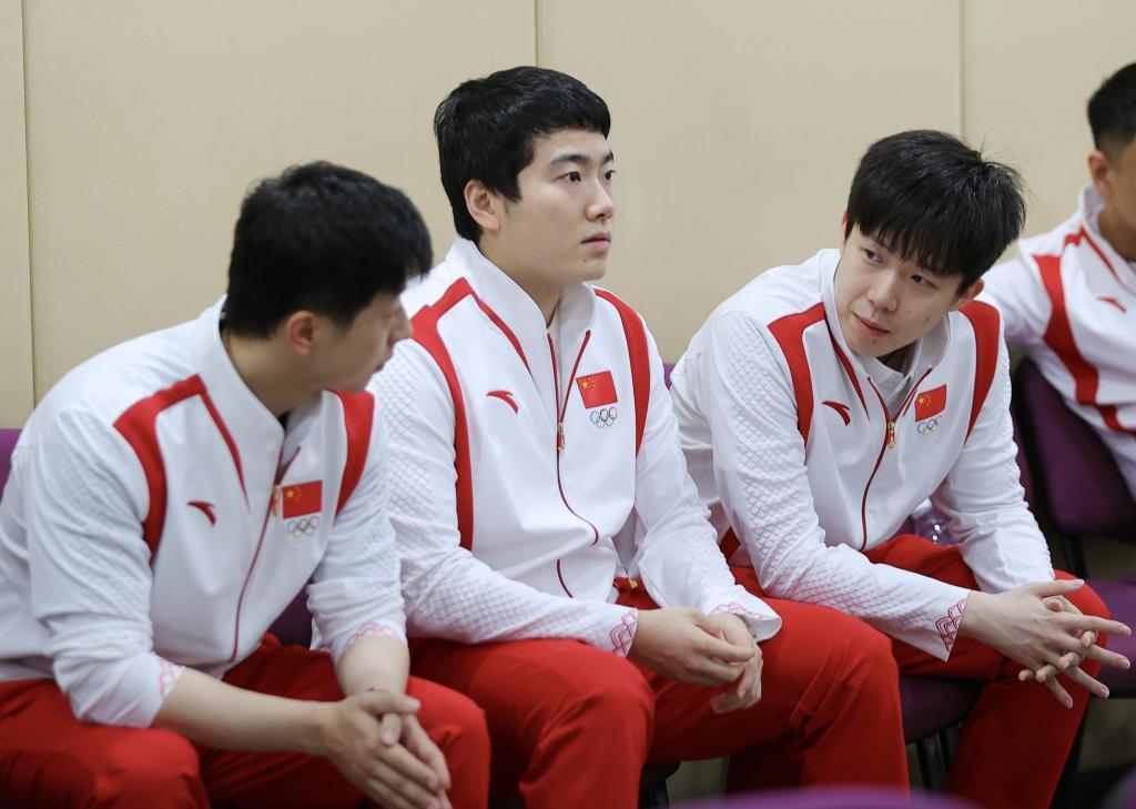 这是马龙、梁靖崑和王楚钦(从左至右)在大会前。新华社记者 丁旭 摄