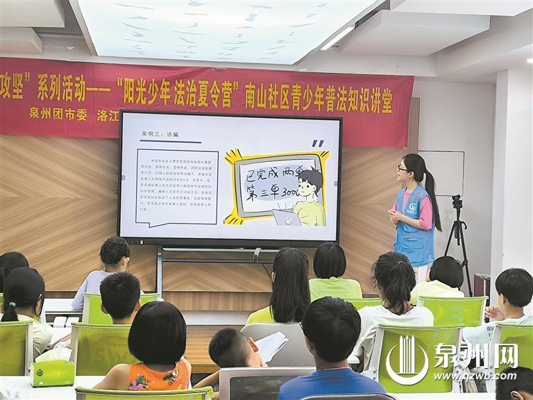 泉州网7月21日讯(融媒体记者廖培煌 通讯员段里鹏 实习生林雨婷 文/图)在这盛夏时节,当蝉鸣与阳光交织成一曲青春的乐章,我市不少青少年迎来一段特别的旅程。连日来,洛江团区委联合启航社工,依托洛江各社区青少年事务综合服务平台,开展普法宣传教育主题暑期夏令营,通过邀请派出所民警、律师等形式,为青少年上“专属”的法治课。