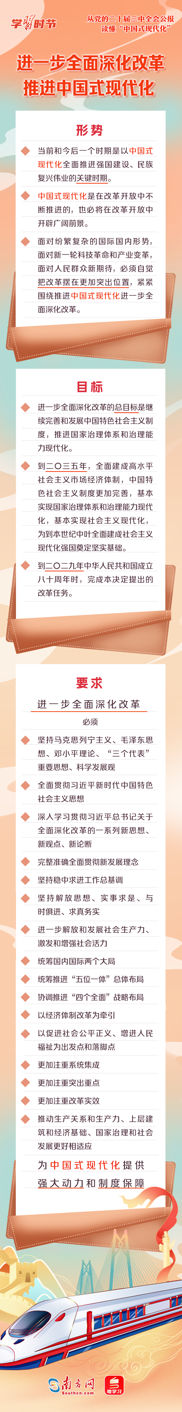 中国式现代化是中国共产党和中国人民长期实践探索的成果,是一项伟大而艰巨的事业。全会公报中,“中国式现代化”一词被反复提及,深刻阐述了进一步全面深化改革与推进中国式现代化的关系,以及中国式现代化的重要保障、必然要求、本质要求等重要内容。一起来学习!