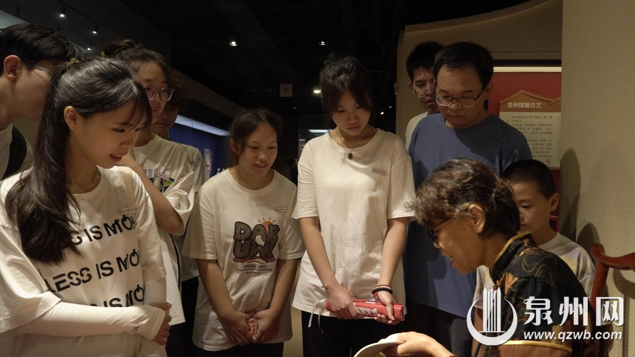 实践队师生参观考察了泉州非物质文化遗产馆,沉浸式领略了泉州纸扎、泉州布雕画、泉州通草工艺、泉州锡雕技艺、泉州金苍秀技艺、惠安石雕、惠安木雕、永春纸织画、永春漆蓝制作工艺、木偶头雕刻、花灯制作技艺等非遗项目,近距离感受拍胸舞、火鼎公婆等民间艺术和南音、木偶戏、梨园戏等传统音乐戏剧以及惠女服饰、闹元宵习俗,在现场观摩中为水密隔舱福船制造技艺、德化白瓷、闽南传统民居建筑技艺等传统技艺发出惊叹。