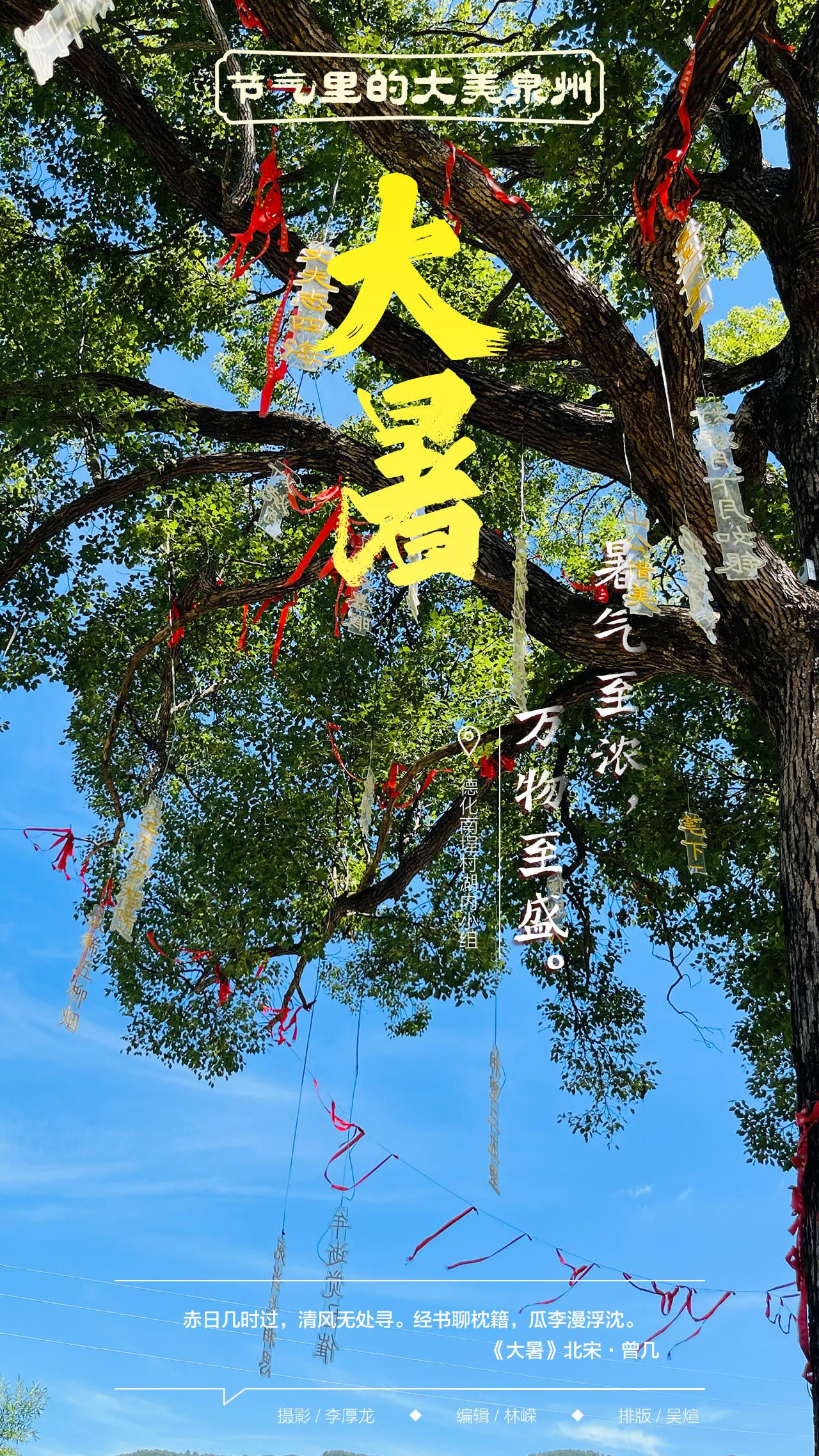 大暑是二十四节气中的第十二节气,也是夏季的最后一个节气。最早记载大暑的是《逸周书·周月解》,书中指出,“夏三月中气,小满、夏至、大暑”。“暑"是炎热的意思,大暑,指炎热之极。经过小暑的酝酿,到大暑时已然热至极点。尤其是晌午过后,暑气蒸腾,将一桶水泼在水泥地上,能听见“嗤嗤”的响声,间或,还能看见一缕缕缭绕的白烟,人从路面走过,能很明显地感受到地面挥发的热气。