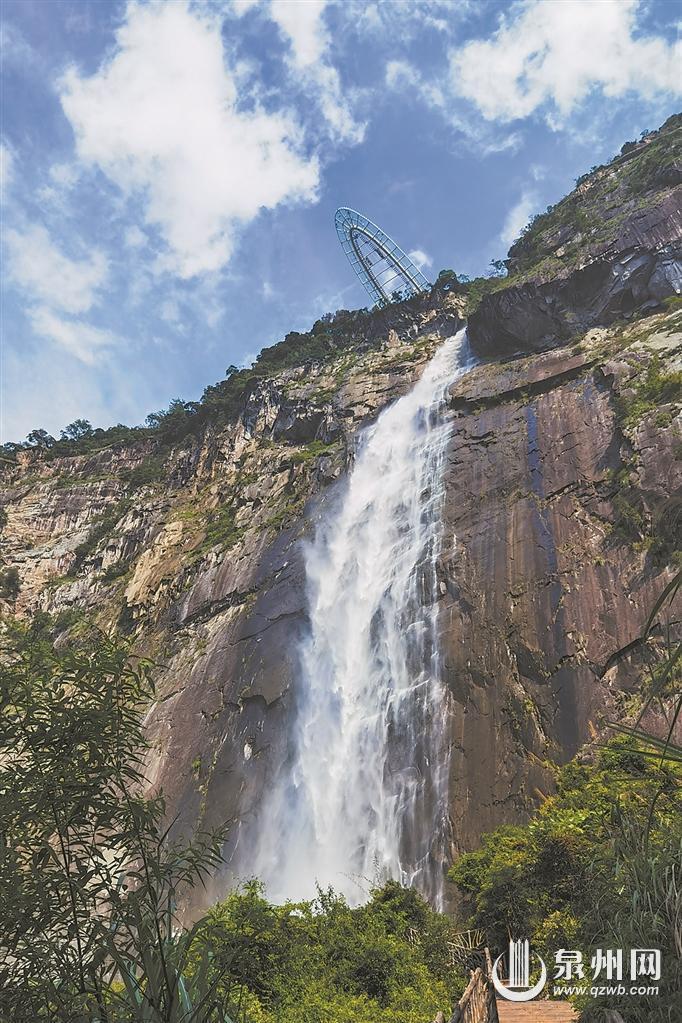 “人还没靠近,一阵阵冰凉就袭过来了。”王昊睿带着放暑假的孩子从福州一起来到德化避暑玩山游水。在单级落差达280.12米的岱仙瀑布下,王昊睿一边感受“华东第一瀑”带来的劲爽,一边摆出各种造型,在珠花四溅、云漫雾绕中定格清凉的瞬间。“好爽,好冰啊,这是天然氧吧、天然空调!”王昊睿的儿子小王开心得尖叫了起来。兴奋过后,他们一家在瀑布底下的咖啡休闲区里,找个位子坐下,背临岱仙瀑布,身边是潺潺流水,头顶是绿树成荫,喷头喷出的水雾缭绕在脚边,恍若仙境,惬意而放松。傍晚时分,王昊睿一家来到岱仙瀑布顶端的天空之心,走在这个“世界垂直高差最大的单边玻璃悬廊”的全透明的玻璃平台之上,俯视飞流直下的岱仙瀑布,高空的悬浮感、水流的冲击感,让王昊睿有种“在瀑布中漂流”的幻觉,临崖观瀑又刺激又浪漫。