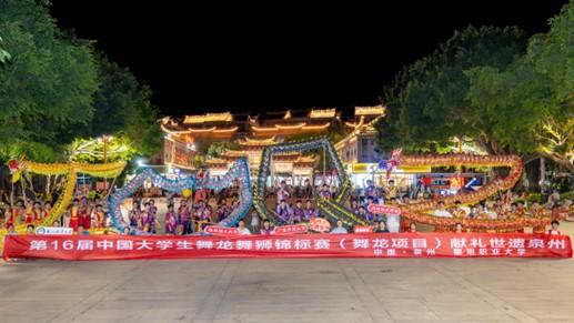 泉州网7月23日讯(记者洪荣堆 通讯员迟善娇 张夏洁)第16届中国大学生舞龙舞狮锦标赛(舞龙项目)在黎明职业大学举办期间,大赛赛区组委会策划了一场别开生面的舞龙快闪活动——7月21日晚上,黎大组织国内四所院校的舞龙队伍在泉州府文庙广场惊艳亮相。