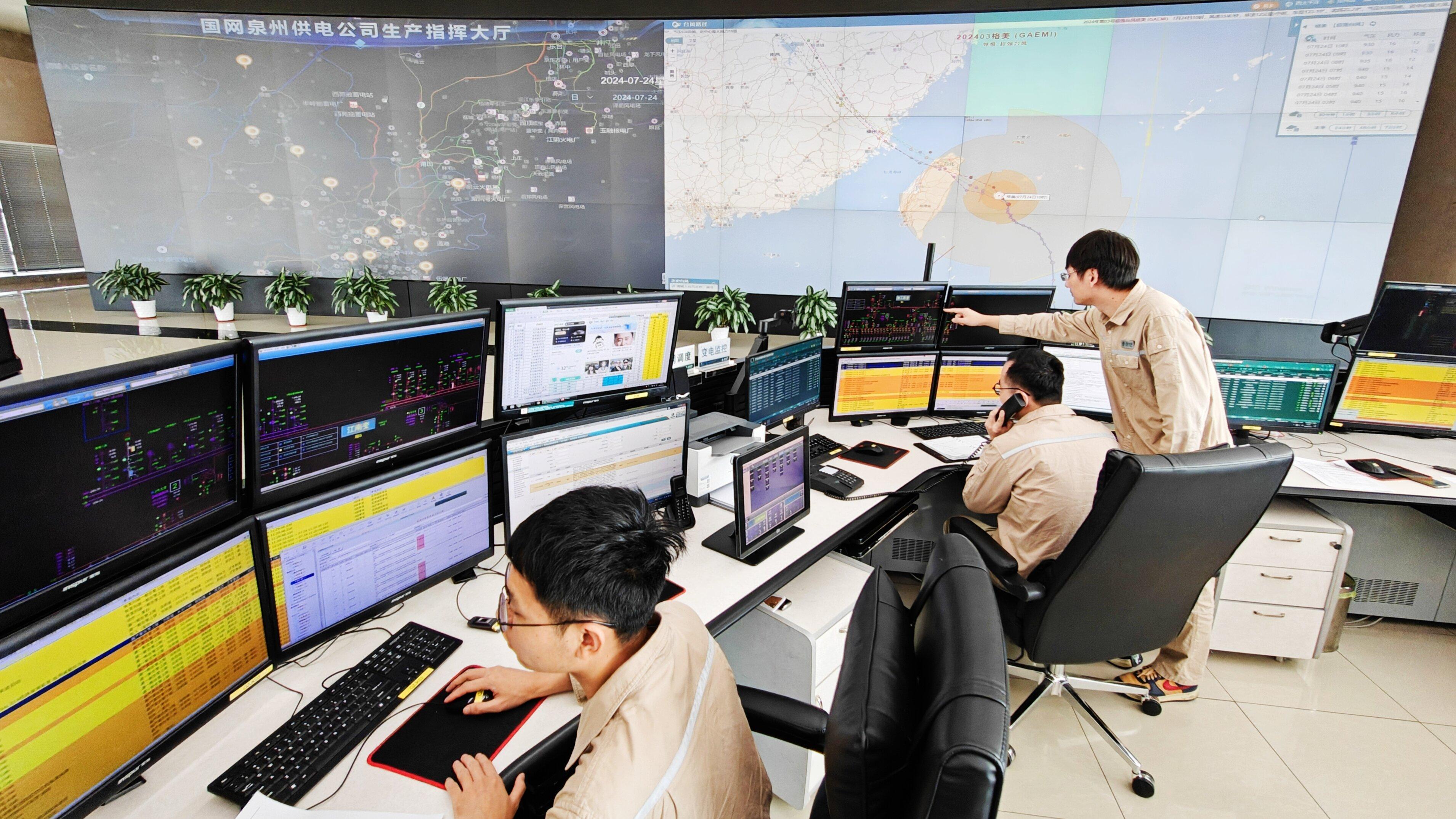 7月24日,在国网泉州供电公司生产指挥大厅里一片繁忙,调度、监控、信通等专业人员密切跟踪监测台风路径变化和电网运行情况,协作配合开展电气设备信号分析,指挥输变电运维、检修专业做好巡视维护、消缺等工作,确保在台风影响前完成缺陷处理,为电网稳定运行增添保障。